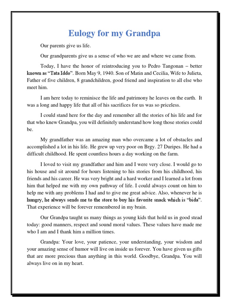 Eulogy Template For Friend Funeral Eulogy Examples Grandfather losing your grandfather is hard, no matter what age you are at the time he passes away. Here are tips to help write a heartfelt eulogy,. We’ve all heard the heartwarming stories. What do you say in a eulogy for your grandfather? eulogy examples for grandfather. writing a eulogy for a beloved grandfather can be a daunting. Funeral Eulogy Examples Grandfather.